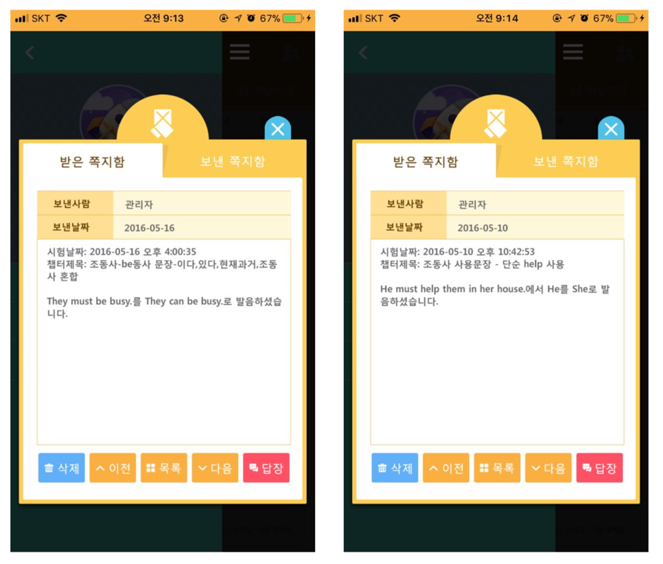 시험 파일을 제출하면 학습 튜터가 첨삭 후, 피드백 메시지를 전송합니다.