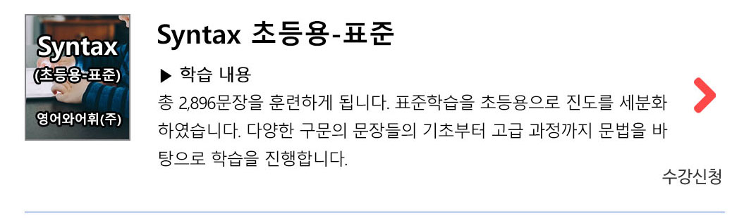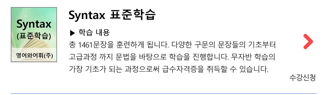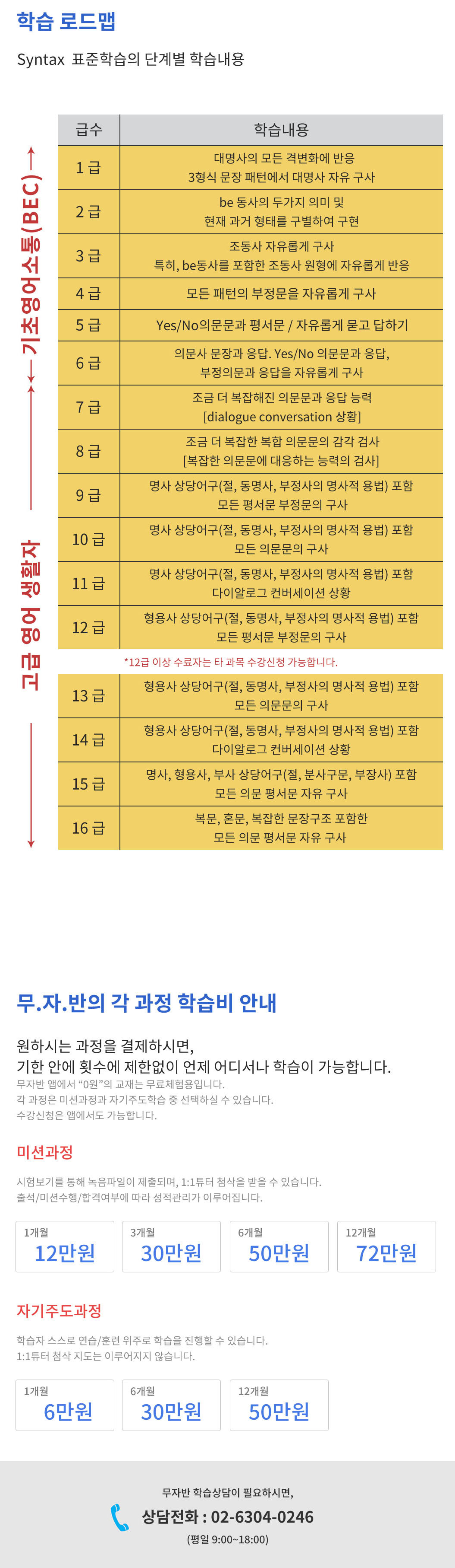 왕초보부터 고급 말하기 과정까지! 미취학 아동부터 성인까지! Syntax 급수시험과정은 무자반 학습의 기초필수 과정으로써, 급수자격을 취득하며 훈련을 진행합니다. 레벨테스트를 통해, 첫 시작 챕터로 배정 받게 됩니다. 대명사 학습의 1급 부터 복잡한 문장 구조의 16급까지 단계별 학습으로 준비되어 있습니다.